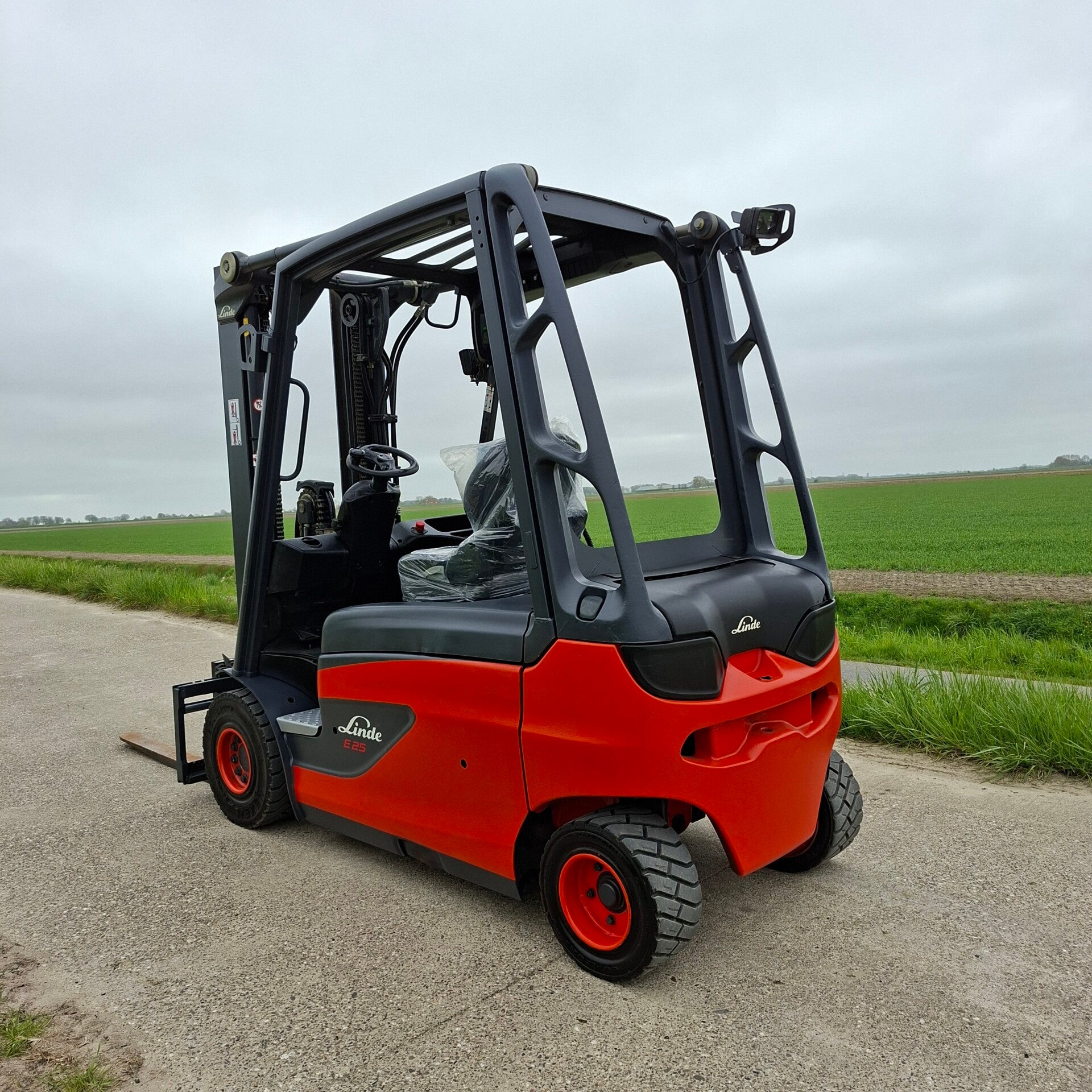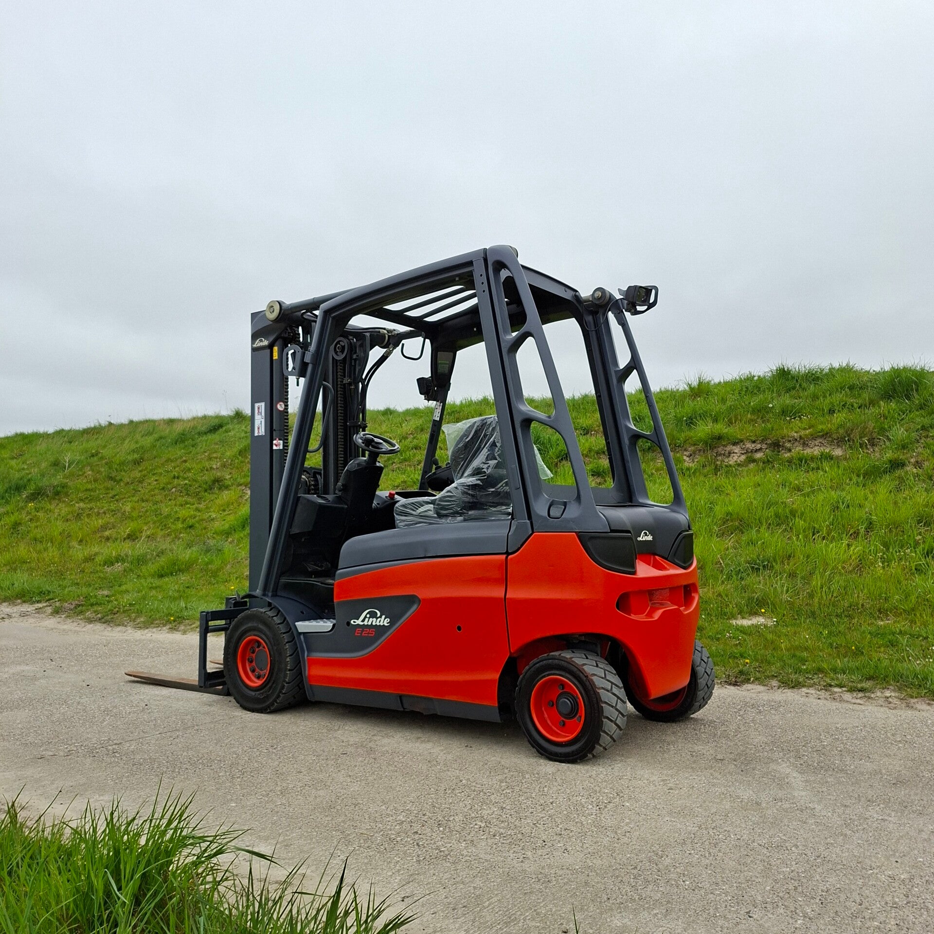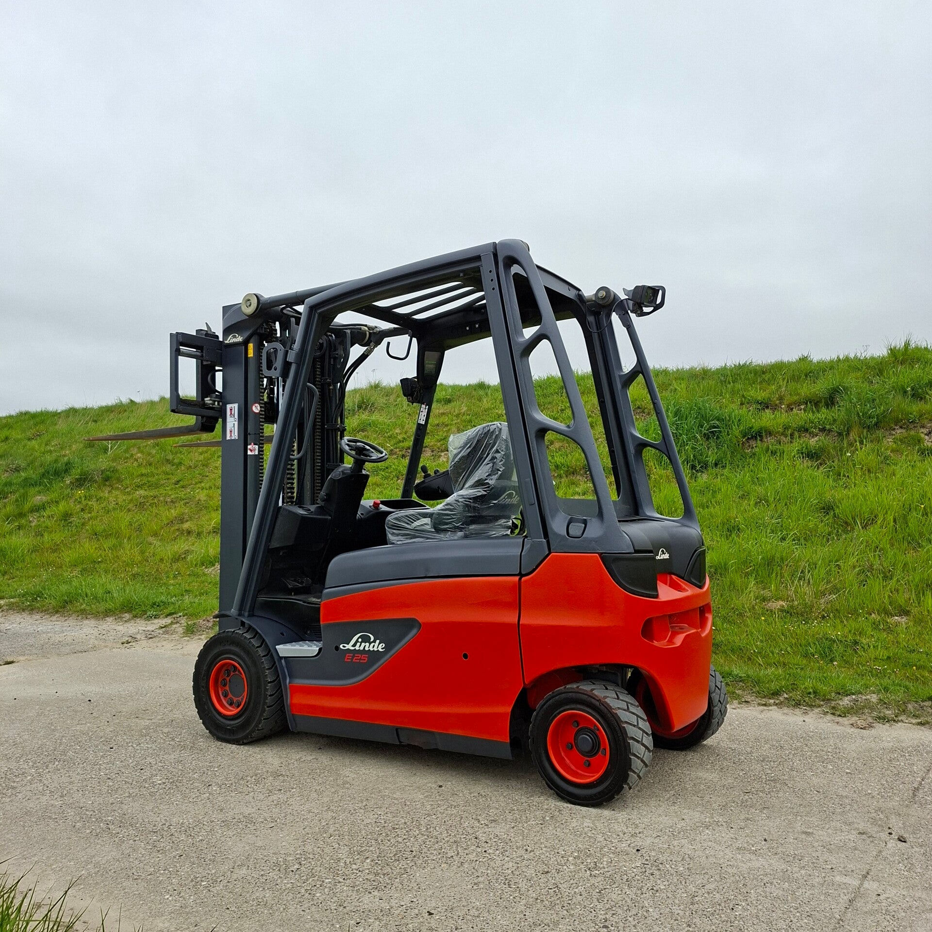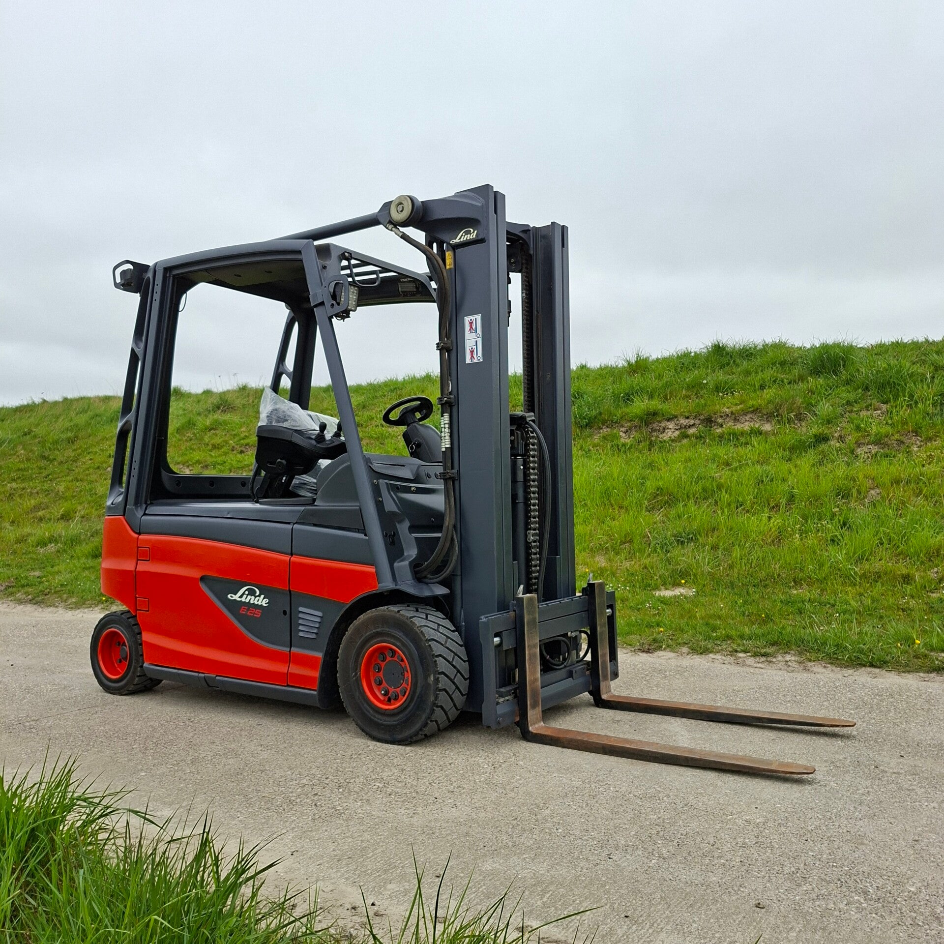 Te koop: Een zeer nette Linde E25 elektrische heftruck met een capaciteit van 2.5 ton, triplomast, freelift en sideshift.